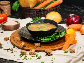 A healthy mix of fresh seasonal vegetables, carefully cooked for a light soup full of natural flavors.
