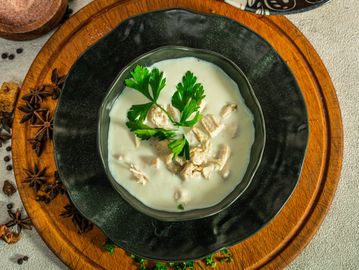 A smooth and creamy soup made from fresh chicken broth with tender pieces of chicken.